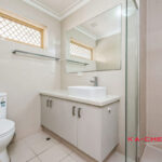 The renovated bathroom is finished with a stone-top vanity, floor-to-ceiling tiles and a semi frameless glass shower screen, delivering a clean, contemporary look. The full-height tiling enhances durability while adding a sense of space and quality to the room.